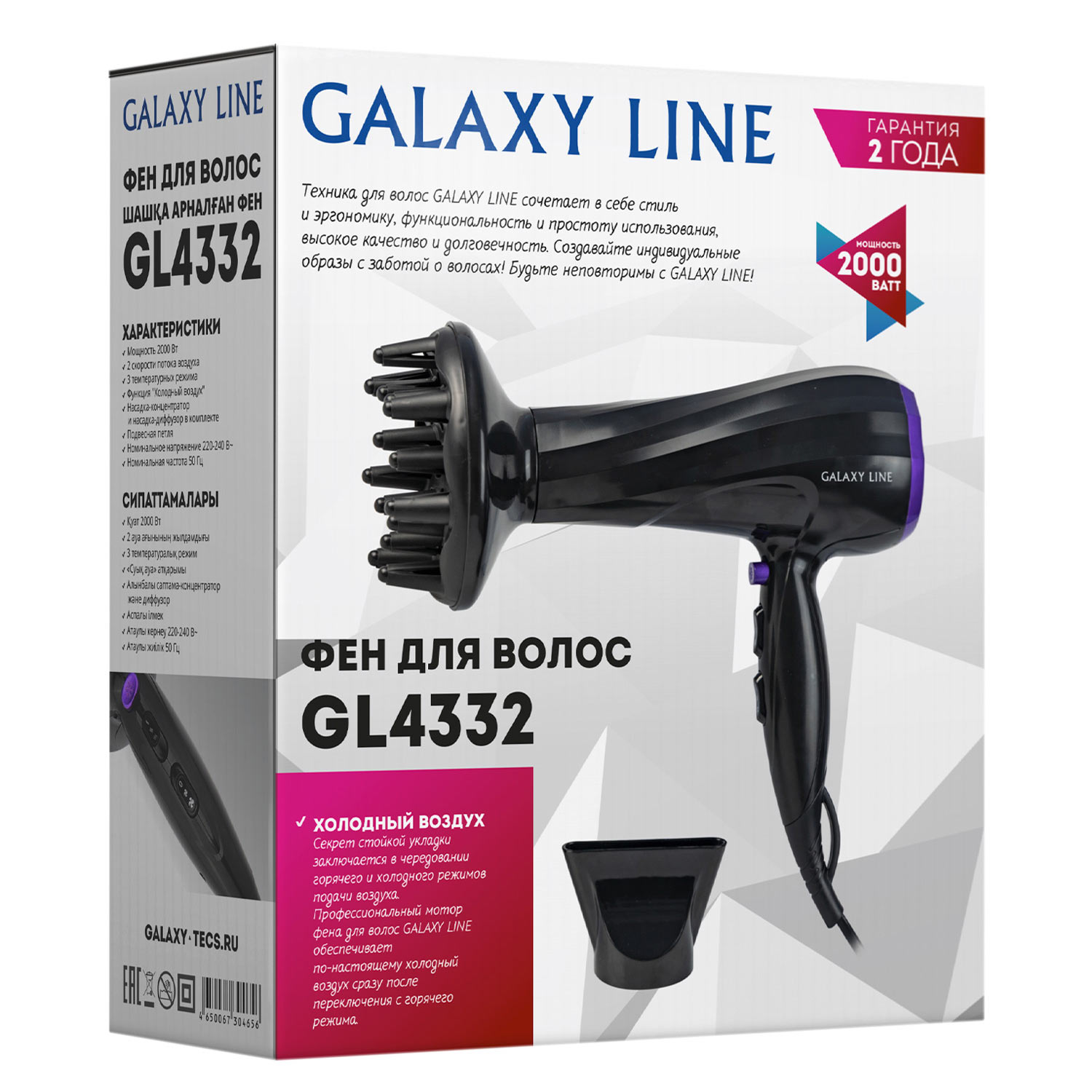 Фен Galaxy LINE GL4332 2000Вт, 2 скорости, 3 режима, черный