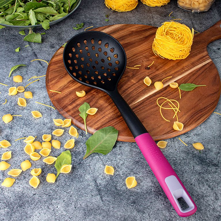 Шумовка TalleR TR-51490 — надежный кухонный инструмент длиной 35 см, изготовленный из безопасного термостойкого пластика, выдерживающего температуру до 210°C. Яркий дизайн с черным корпусом и розовой ручкой делает шумовку стильным и удобным аксессуаром на вашей кухне.Ручка оснащена отверстием для подвешивания, что упрощает хранение и экономит место. Шумовка подходит для аккуратного снятия пенки, процеживания и извлечения продуктов из горячих жидкостей. Изделие легко моется в посудомоечной машине, но рекомендуется избегать агрессивных и абразивных средств, чтобы сохранить поверхность в отличном состоянии.