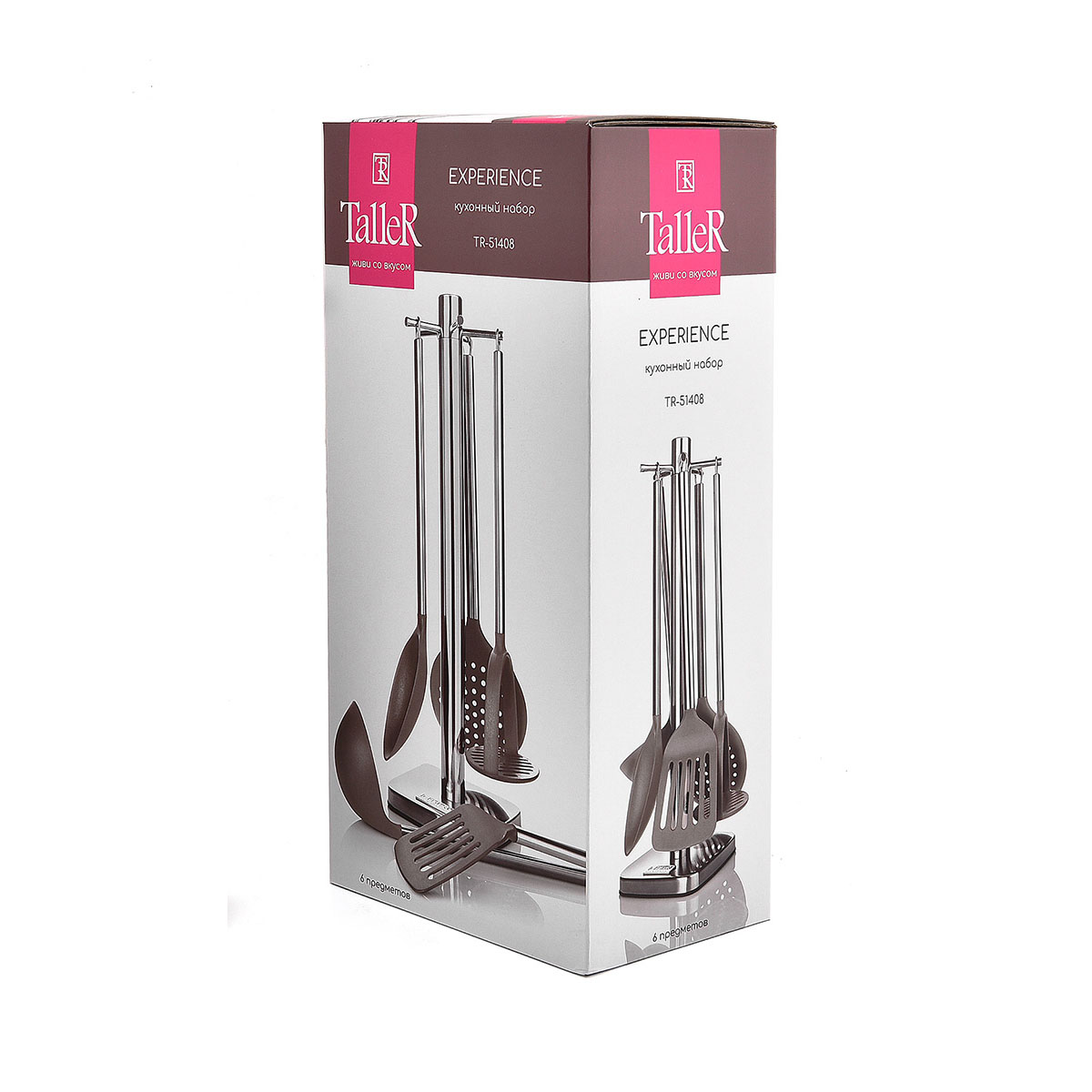 Кухонный набор TalleR TR-51408 — стильный и функциональный комплект из шести кухонных инструментов с удобной вращающейся подставкой. Изготовлен из нержавеющей стали и термостойкого пластика (нейлон), выдерживающего температуру до 210°C. Подставка выполнена из нержавеющей стали с противоскользящими протекторами для устойчивости и комфорта в использовании. Цвет пластика — светло-коричневый, а матовый серебристый оттенок подставки придаёт набору элегантный и современный вид.