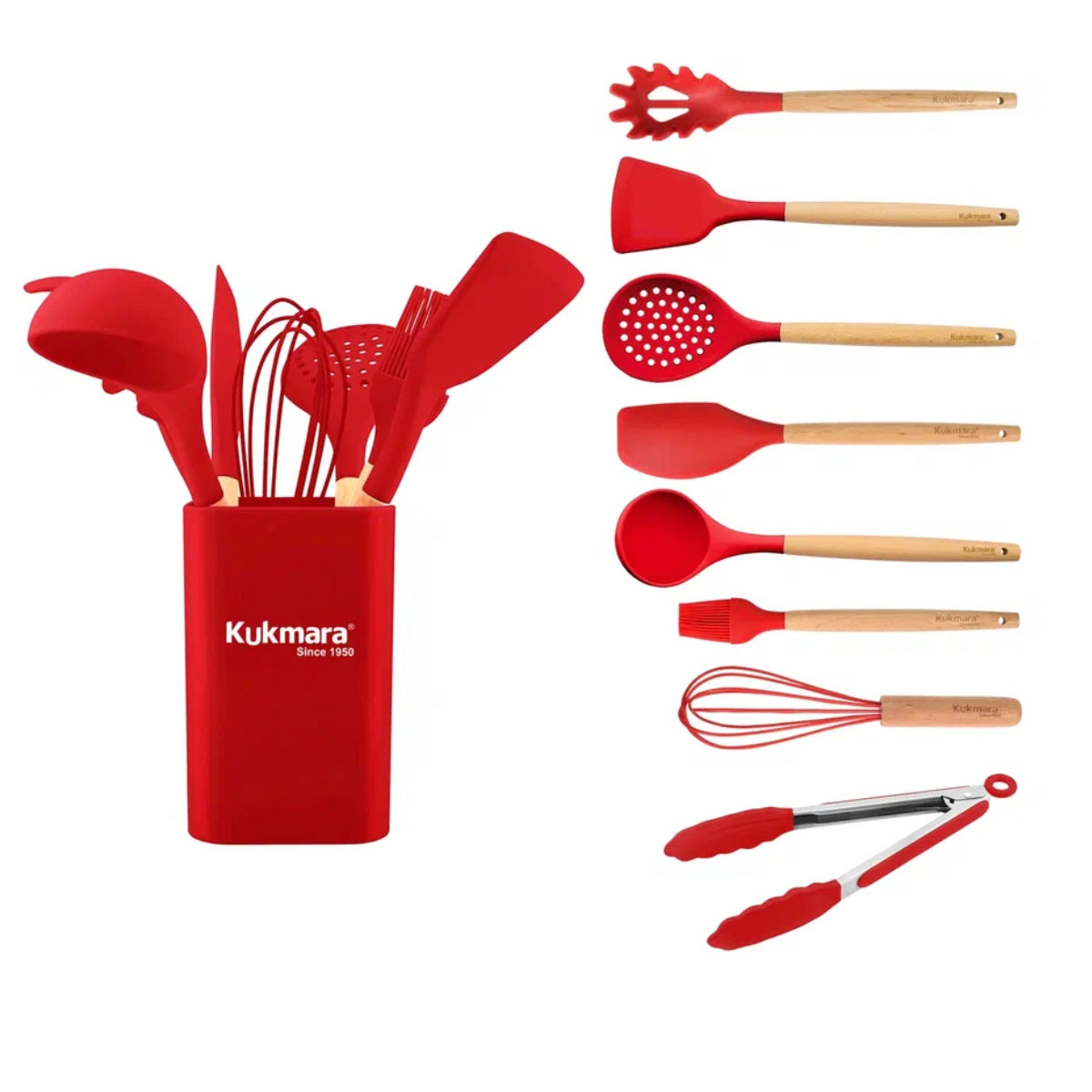 Рабочие части изготовлены из термостойкого силикона, который не впитывает запахи и не царапает антипригарную посуду. Натуральные деревянные ручки с логотипом Kukmara не скользят в руке и оснащены отверстиями для подвешивания. Стильный универсальный держатель поможет удобно разместить весь комплект.