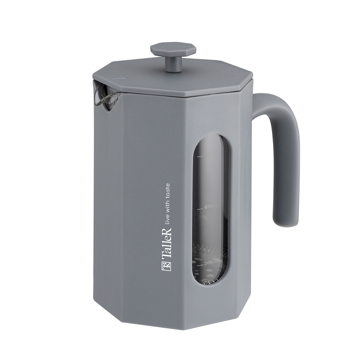 Френч-пресс TalleR TR-32344 "Лоренцо» объемом 800 мл — это практичный и стильный аксессуар для любителей свежезаваренного кофе и чая. Колба изготовлена из жаропрочного боросиликатного стекла, которое отлично выдерживает перепады температур. Для защиты стекла и удобства использования корпус оснащён надежным пластиковым покрытием серого матового цвета, что придает изделию современный и лаконичный вид.Пресс-фильтр выполнен из высококачественной нержавеющей стали, а удобная ненагревающаяся ручка обеспечивает комфортный захват и безопасность при наливании напитков. Разборная конструкция фильтра значительно облегчает уход за френч-прессом. Такой дизайн сочетает в себе долговечность, функциональность и стиль, позволяя наслаждаться любимыми напитками дома, в офисе или в поездках.