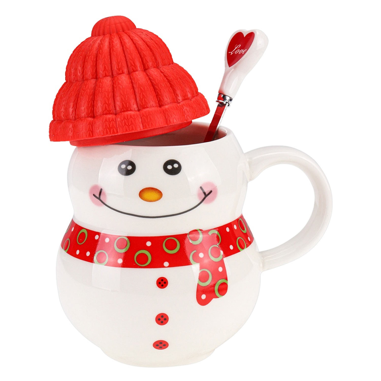 Кружка Новогодняя 300мл КС-2674 с ложечкой и крышкой "Снеговик" красная