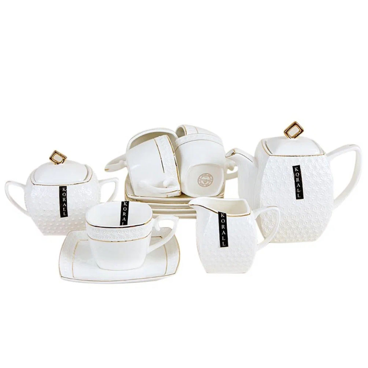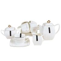 Набор чайный фарфор Коралл "Снежная королева" РТ0115-А, 15 предметов, чашка 240мл., чайник 900мл., сахарница 500мл., золотоая кайма, квадратная форма, белый