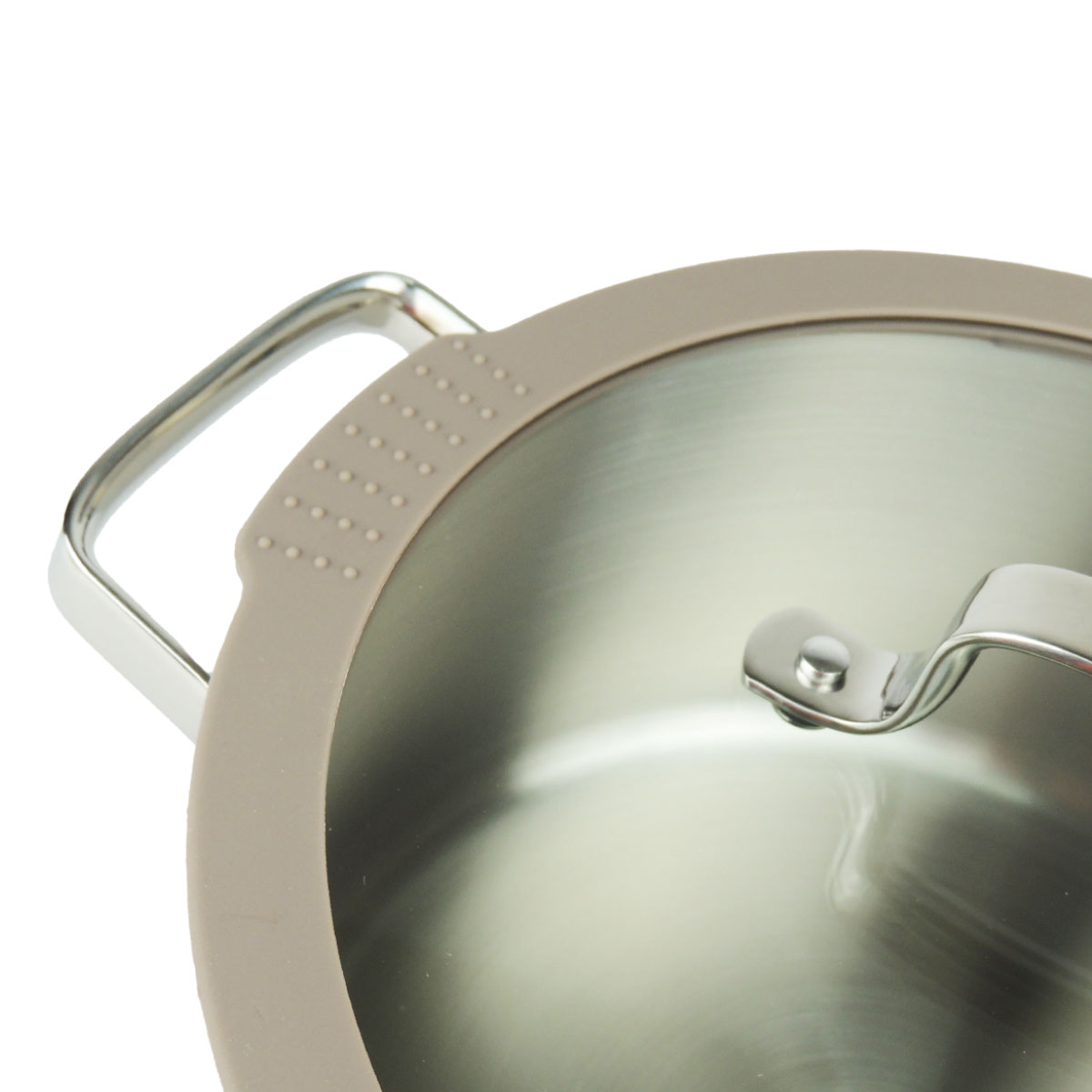 Особенность модели — комбинированная крышка из закаленного стекла с оригинальным силиконовым ободом светло-коричневого цвета. Такая конструкция позволяет удобно сливать жидкость через отверстия, обеспечивает выход пара и бесшумное закрывание кастрюли. Силиконовый обод защищает посуду от сколов и царапин. Ручки выполнены из нержавеющей стали и закреплены точечной сваркой для максимочной прочности. Внутри кастрюли есть удобные отметки литража.