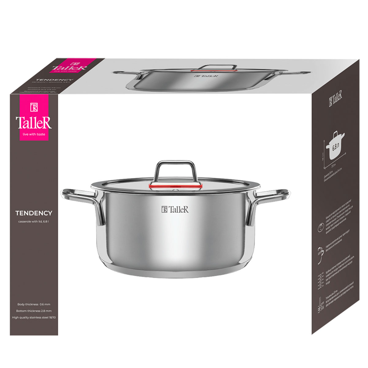 Кастрюля TalleR TR-17275 из серии Тенденси — надёжная и вместительная посуда объёмом 6,8 литра, созданная для комфортного приготовления больших порций блюд. Изготовлена из высококачественной нержавеющей стали 18/10 с зеркальной полировкой внутри и снаружи, что обеспечивает эстетичный вид и простоту ухода.