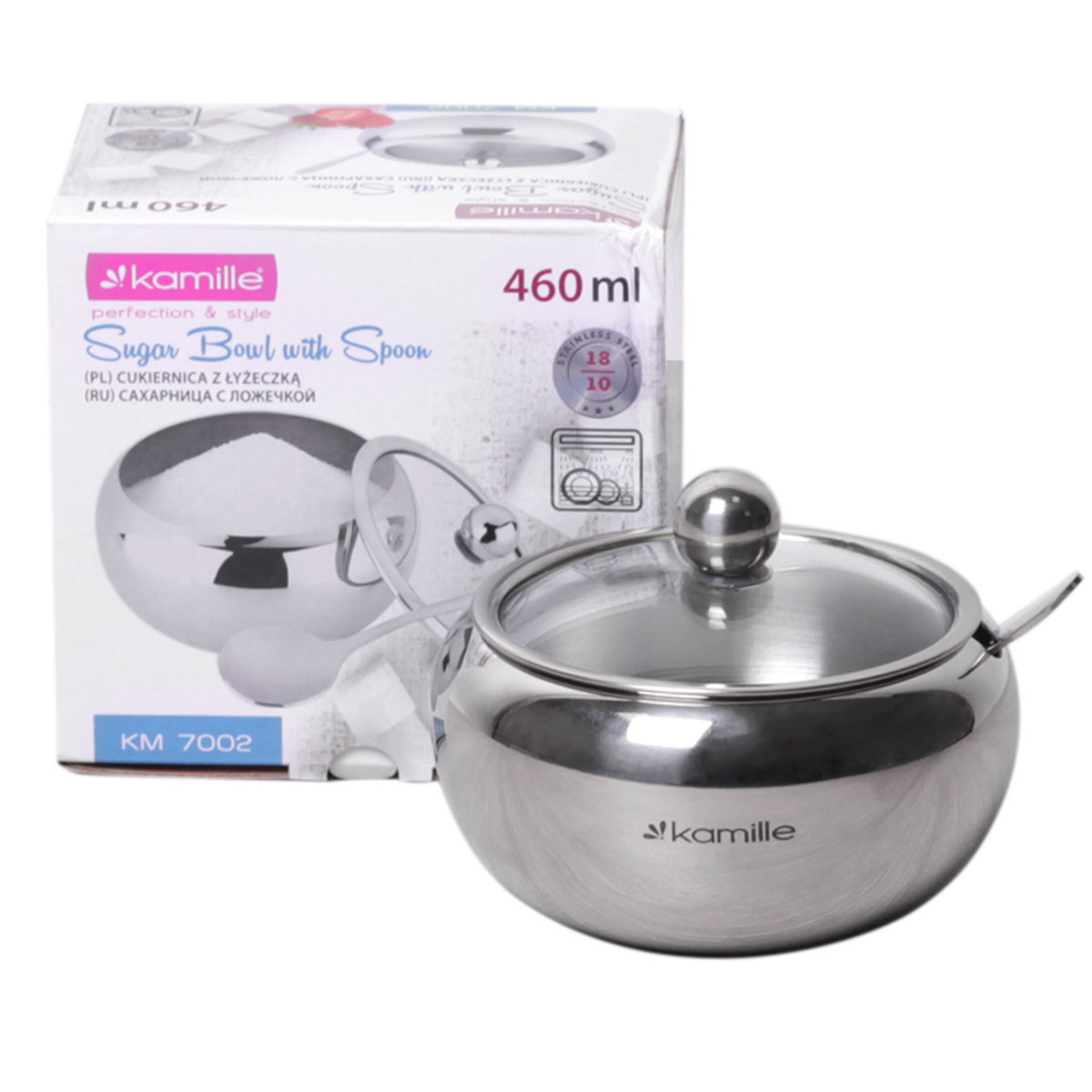 Сахарница нерж. KAMILLE 7002, 460 мл, с ложкой, стеклянная крышка